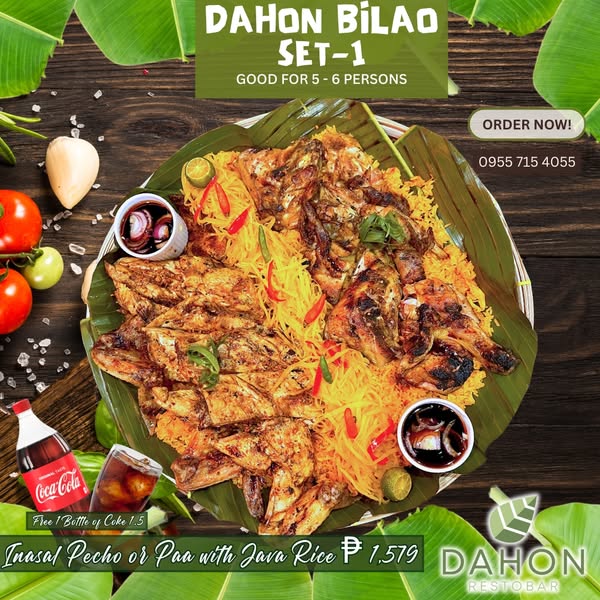 搜索关键词 Dahon Restobar, holiday packages, bilao sets, Filipino food, family meals, group dining, free coke, restaurant delivery, CDO restaurant, holiday feast优势 Good for sharing,Variety of set options,Free 1.5L Coke,Convenient for holiday gatherings