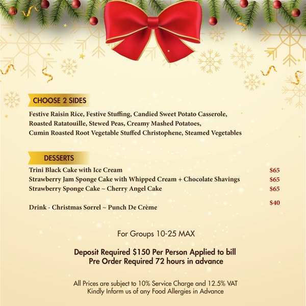 搜索关键词 holiday meal, christmas dinner, group reservation, trinidad restaurant, caribbean cuisine, pineapple ham, festive menu, waves tobago, luncheon menu, seaside dining优势 Festive Menu Options (Pineapple Rum Roast Ham, Festive Raisin Rice),Suitable for Group Gatherings (10-25 people),Convenient Booking (Phone, Email, Website)