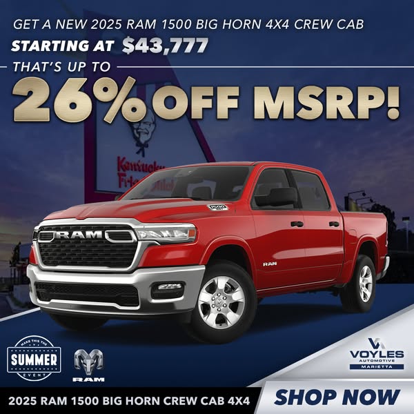 Up to 26% off MSRP applies to select new 2025 RAM 1500. Discount includes all applicable manufacturer incentives and dealer discounts. Taxes, fees, and licensing extra. APR with approved credit. $15.60 per $1,000 financed, regardless of down payment. Residency restrictions apply. See dealer for details. Must take retail delivery by 08/31/2025.