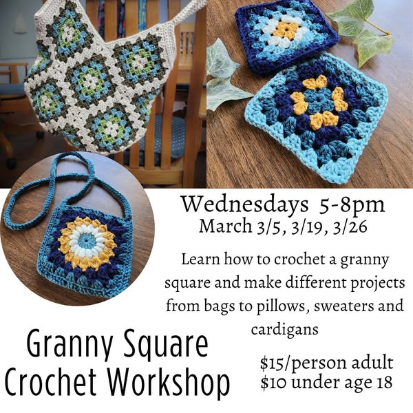 'Granny Square Workshops' are held on Wednesday evenings. Whether you're new to crocheting or looking to refine your skills, these workshops provide a friendly and supportive environment to learn and create beautiful granny squares. Create items from bags to pillows, cardigans and sweaters.