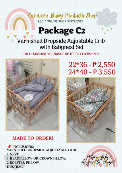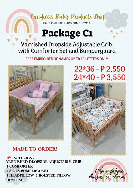 Candice's Baby Products Shop offers you a budget friendly and 100% mall quality baby beddings and wooden crib packages. All of our products are hand-made with love and we are made to order.