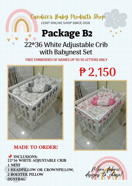 搜索关键词 baby crib packages, baby beddings, affordable cribs, handmade baby products, mall quality baby items, baby furniture, metro manila baby shop, tugatog malabon, crib sets, baby bedding sets优势 Budget friendly,100% mall quality,Hand-made with love,Made to order,Multiple shipping options