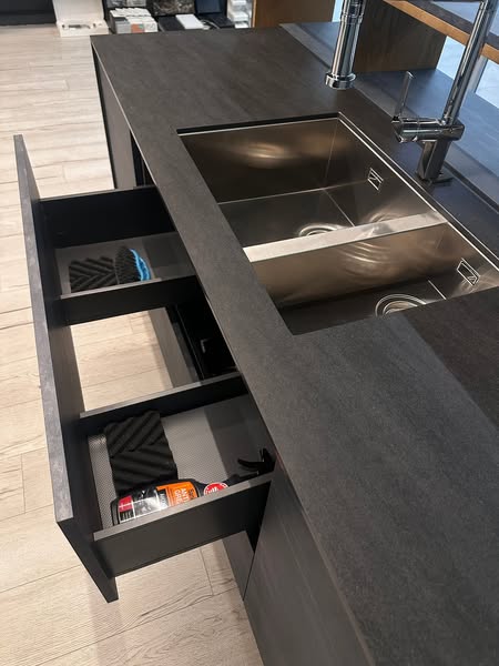 •Sisteme inovatoare de depozitare — sertare cu închidere lentă, compartimente ascunse pentru condimente și sticle, precum și organizatoare practice pentru ustensilele de bucătărie.
