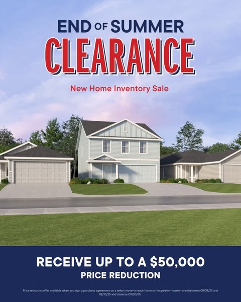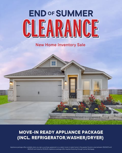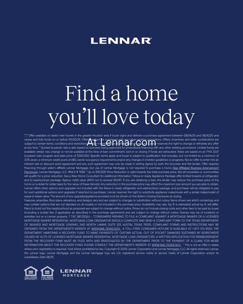 Offer available on select move-in ready homes in the greater Houston area if buyer signs and delivers a purchase agreement between 08/04/25 and 08/10/25 and closes by 09/30/25. Interest rate requires financing through Lennar Mortgage.