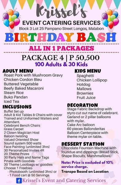 搜索关键词 Kiddie party catering, Catering service Malabon, Affordable party packages, Birthday party catering, Event catering services, Catering inquiries and bookings, Party venue Malabon, Catering for children, Krissels Event Catering, Birthday catering package优势 Affordable packages,Catering service,Easy booking and inquiry