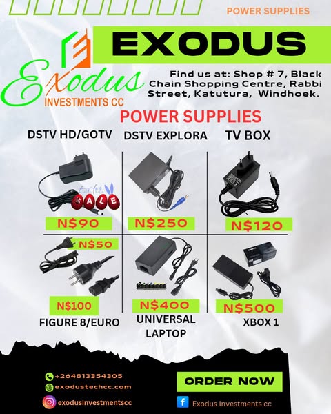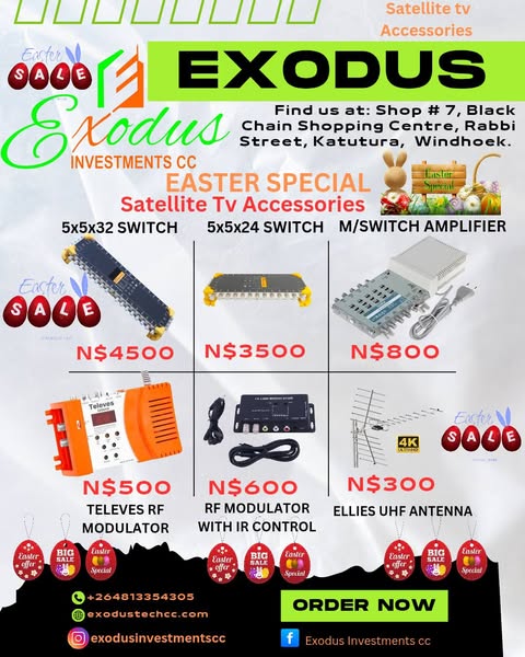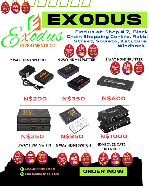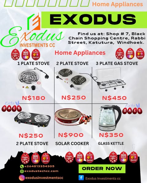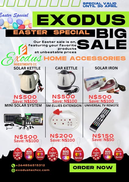 搜索关键词 Easter Specials, April Deals, Namibia Shopping, Limited Time Offer, Best Deals, Discounts You Love, Nationwide Courier, Black Chain Shopping Centre, Katutura offers, Exodus Investments Namibia优势 Amazing discounts,Limited-time deals,Nationwide courier services