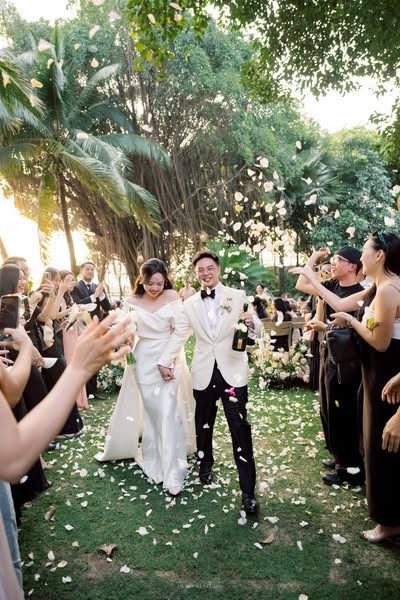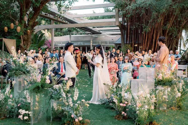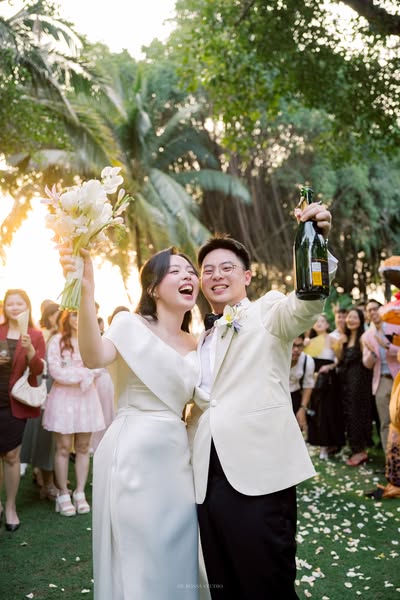 As the evening sun gently filtered through the leaves, Du, in her pristine and graceful wedding gown, and Long, dashing in his white tuxedo, exchanged heartfelt vows before family and friends. The laughter, applause, and happy gazes of the guests made the atmosphere warm and memorable.