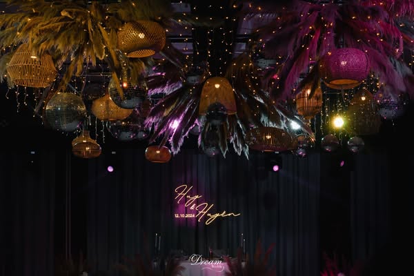 The focal point of the party was the stage area with the dominant white and brown tones of reed grass, accented with disco balls around, reminiscent of the couple's dating period - free, liberal, and passionate. Besides that, the photo booth area was equally prominent with a transparent box, creating both a unique difference and reflecting Huy & Huyen's interests and personalities.