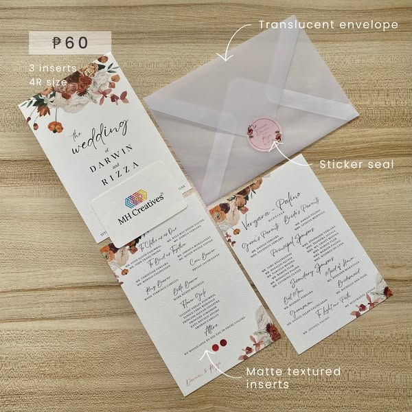 搜索关键词 invitation cards wedding, debut invitation cards, birthday invitation, event souvenirs philippines, party favors philippines, personalized invitation, affordable invitation cards, custom event invitations, MH Creatives PH, COD payment invitations优势 Free Layout,Inclusions: Card, Envelope, Seal,COD Payment Available,Rush Orders Accepted,Additional options like RSVP and soft copies