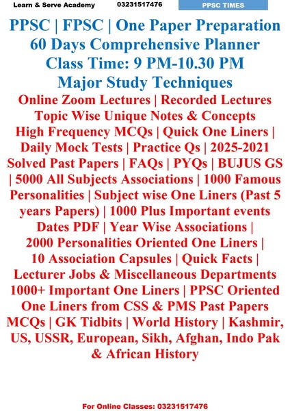 搜索关键词 PPSC FPSC exam preparation, Competitive exams Pakistan, General knowledge test, Learn Serve Academy, 60 days planner, Exam study techniques, One paper exams, Pakistan government jobs, CSS PMS preparation, Test preparation course优势 Smart Study Strategy,Daily Mock Tests,Solved Past Papers,Comprehensive coverage of topics