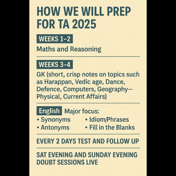Territorial Army 2025 – Crack the Exam with NCA Academy in Just 2 Months! 📅 Start of Application: 12th May 2025 📅 Date of Examination: 20th July 2025 Preparing for the Territorial Army 2025 exam? Join NCA Academy’s fast-track 2-month course and master the complete syllabus through a focused, time-bound strategy with expert guidance. 📌 Course Highlights: Weeks 1–2: Complete focus on Maths & Reasoning Weeks 3–4: Crisp & compact GK notes (Harappan, Vedic Age, Defence, Computers, Geography, Current Affairs & more) Parallel English Prep: Daily practice on Synonyms, Antonyms, Idioms, and Fill in the Blanks Every 2 Days: Chapter-wise tests and performance feedback Live Doubt Sessions: Every Saturday & Sunday evening 🎯 Designed for both working professionals and full-time aspirants — your complete preparation is covered in just 8 weeks! 👉 Enroll now with India’s most trusted defence academy and get ahead of the competition. 🔗 For more details, visit:
