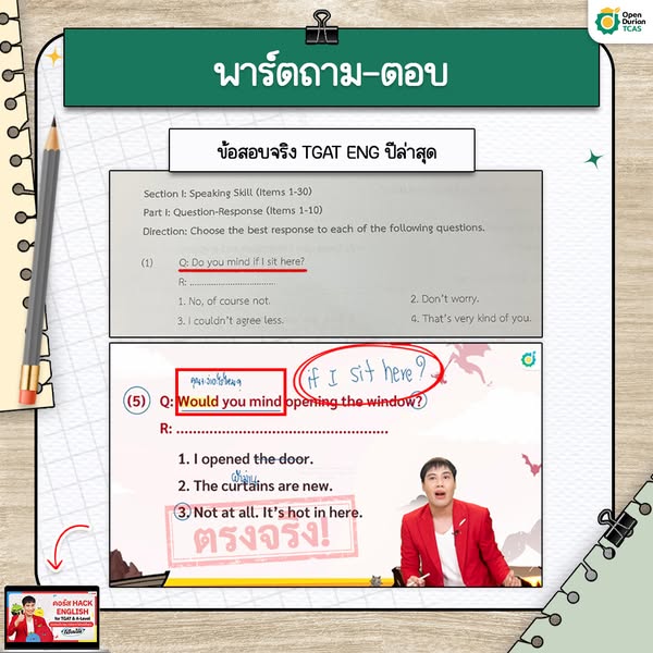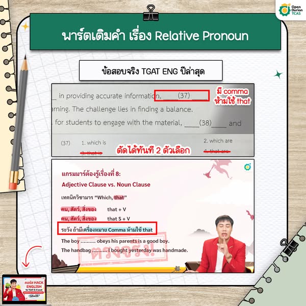 搜索关键词 TGAT ENG exam prep, OpenDurian review, Test preparation course, Thai university entrance, Proven exam success, Kru P' Wan tutor, Exam techniques, Comprehensive learning, University Exam, Thai Exam优势 Accurate prediction of exam content.,Proven success with students.,Comprehensive coverage of exam sections.,Practical exam techniques.,Endorsement by "Kru P' Wan" OpenDurian.