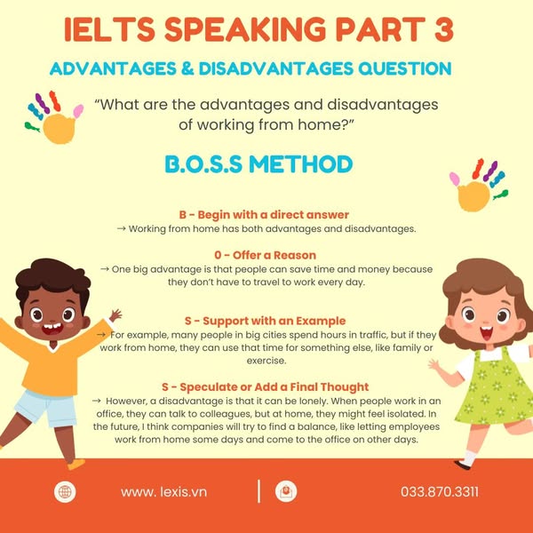 搜索关键词 IELTS speaking part 3, IELTS speaking tips, IELTS speaking formula, IELTS preparation, IELTS band score, improve IELTS speaking, IELTS exam Vietnam, Lexis Vietnam, study abroad, IELTS course优势 Simple and effective formulas for IELTS Speaking Part 3.,Covers various question types.,Boosts confidence in answering questions.