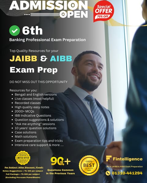 11-OCTOBER থেকে ৬ষ্ঠ #JAIBB / #AIBB পরীক্ষা শুরু হচ্ছে। প্রস্তুতি নিচ্ছেন? আমাদের স্পেশাল ব্যাচ শুরু হচ্ছে 1-AUGUSTথেকে। ২ মাসের মধ্যে পুরো কোর্স ভালোভাবে শেষ করা হবে। নতুন সাবজেক্ট BASIC ACCOUNTING সহ সবগুলো সাবজেক্ট এর বেস্ট নোটস এবং সাজেশনস এখনই কালেক্ট করতে পারেন।