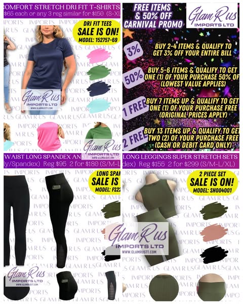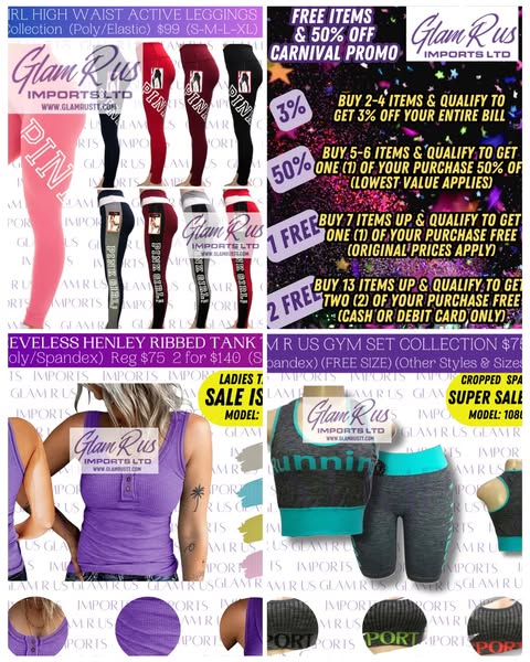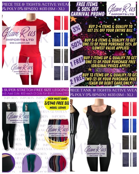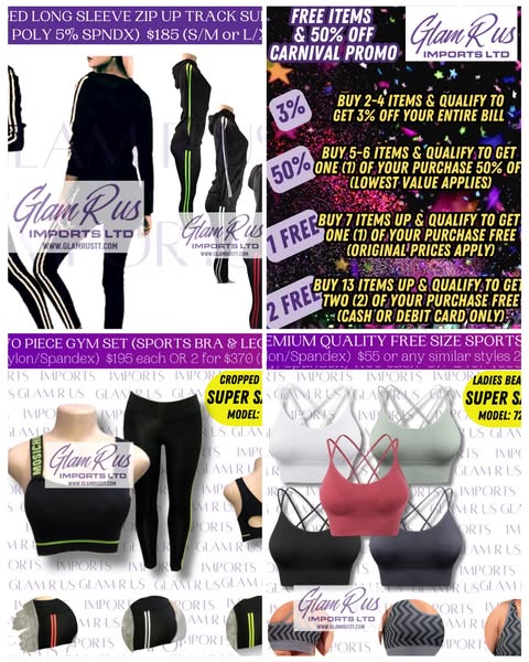搜索关键词 gym wear deals, active wear promotion, sports bras sale, carnival clothing, free items offer, plus size clothing, men women kids apparel, nationwide delivery, El Socorro Showroom, holiday apparel优势 Wide variety of gym wear,Deals and promotions available,Available for men, women, and kids, including plus sizes,Free items with purchase,Nationwide delivery