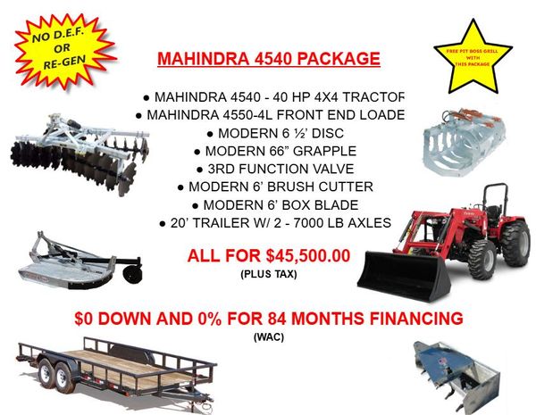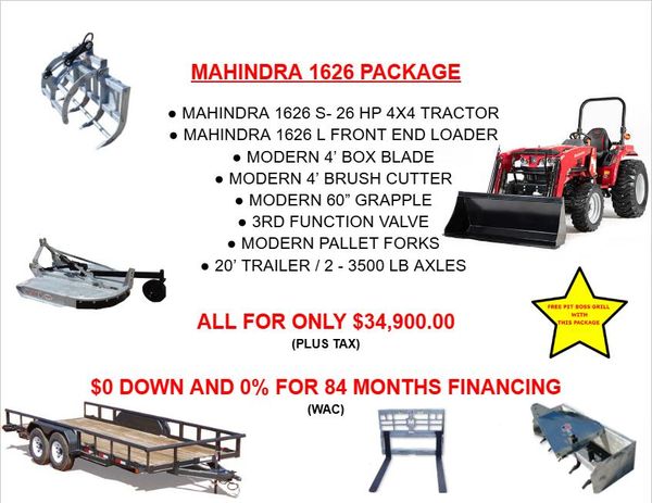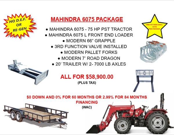 搜索关键词 Mahindra Tractors, Pit Boss Grill, 0% Financing, Tractor Packages, Free Delivery, Agricultural Equipment, No DEF, Tractor Sales, Farm Equipment, Mahindra Finance优势 Free Pit Boss Pellet Grill,$0 Down and 0% Financing,Free Delivery Up to 75 Miles,No DEF or Re-Gen
