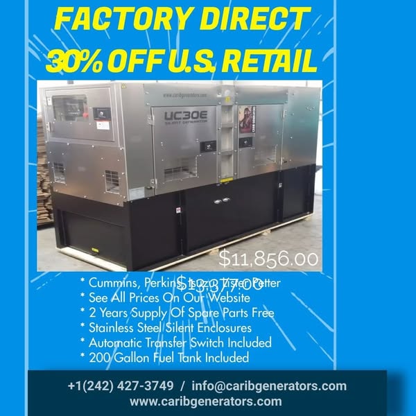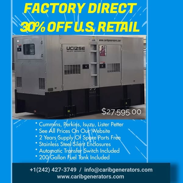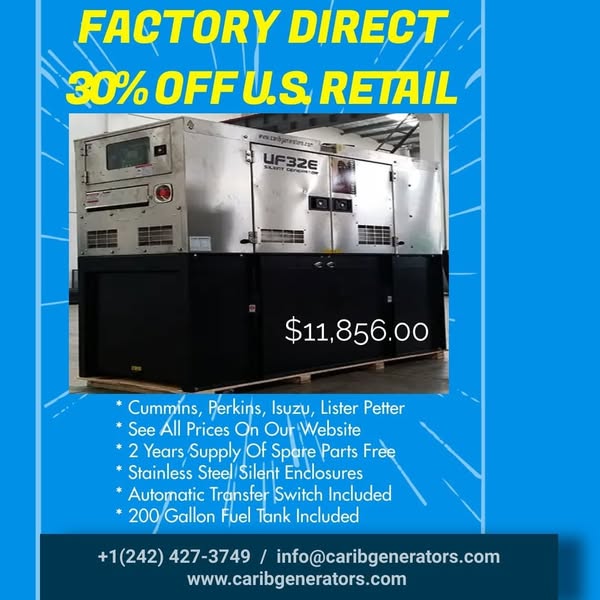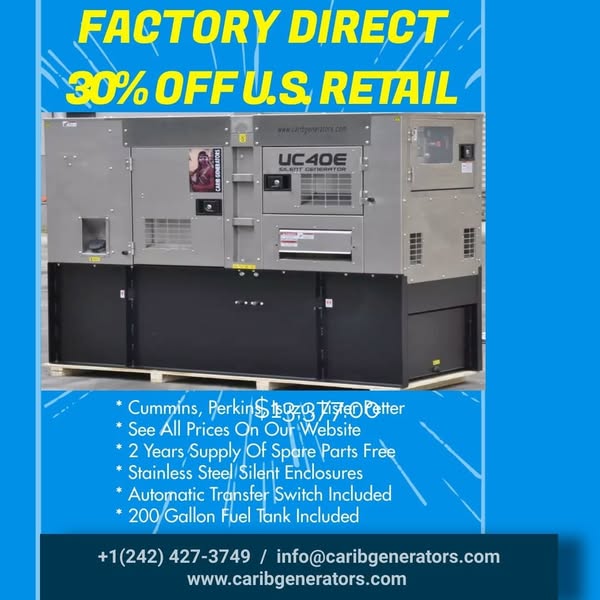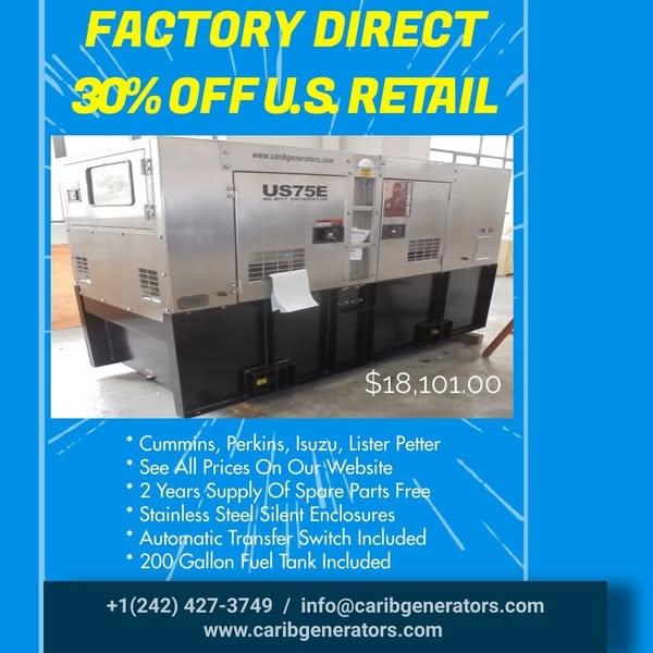 See All Prices On Our Website * 9kva to 3250kva Diesel Generators * 2 Years Of Free Spare Parts * 12-Month Warranty * Prime Or Standby Power Gensets * Standard, or Stainless Enclosure * Mobile, Stationary, or Containerized * Single Wall or Double Wall Tanks * 100 to 300-gallon Fuel Tanks * Automatic Transfer Switches * +1 (242) 427-3749