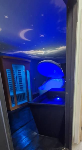 We have 3 rooms. Our dark room is a single pod, single sauna, and ice bath. We have a light room, which has a double pod, double sauna, and ice bath, perfect for couples or mate dates! We also have our hyperbaric oxygen chamber room. Hyperbaric oxygen therapy is used for many different things; we have clients using it to help with recovery from operations, to help with aging, for pain relief, to reduce inflammation, and many more benefits. You can literally spend hours here and leave feeling on top of the world; we can guarantee that.