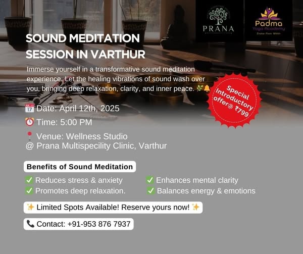 🌿 Step Into Stillness with Sound 🌿 Join us for a deeply relaxing Sound Meditation Workshop, where the healing power of sound meets mindful presence. Experience the calming vibrations of Tibetan singing bowls, gongs, and other sacred instruments designed to quiet the mind and restore balance. 🎶 What You'll Experience: ✅ Guided Sound Bath & Breathwork ✅ Deep Stress Relief & Emotional Release ✅ Chakra Balancing Through Frequencies ✅ Peaceful Ambience & Comfortable Setup 📅 Date: 12 April 2025 📍 Location: No. 196/4,Beside CMRS Royal Orchid apartments Devasthanagalu,Balagere Road,Varthur,Bengaluru ✨ No experience needed. Just bring an open heart and let the sound do the rest. 🔔 Limited seats – Reserve your spot today!