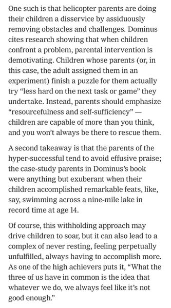 😊Bài học thứ hai là bố mẹ của những người rất thành công thường tránh đưa ra những lời khen ngợi quá … mùi mẫn và cảm xúc (A second takeaway is that the parents of the hyper-successful tend to avoid effusive praise). Tất nhiên, cách tiếp cận này có thể khiến trẻ không bao giờ cảm thấy mình ‘đủ’, lúc nào cũng có cảm giác không thỏa mãn, và muốn đạt được nhiều thứ hơn nữa (this withholding approach may drive children to soar, but it can also lead to a complex of never resting, feeling perpetually unfulfilled, always having to accomplish more).
