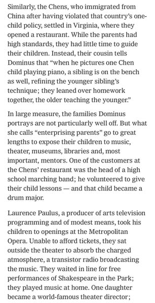 😚Những gia đình không khá giả nhưng có con cái xuất sắc đều có một điểm chung: bố mẹ cực kì cố gắng và sẵn sàng làm tất cả mọi thứ (to go to great lengths) để cho con mình cơ hội tiếp xúc với âm nhạc, nhà hát, viện bảo tàng, thư viện, và quan trọng nhất, là NHỮNG NGƯỜI DẪN ĐƯỜNG (mentors). Ví dụ: một nhà sản xuất các chương trình nghệ thuật trên tv nhưng không có nhiều tiền (of modest means) đã đưa con mình đến xem các buổi khai mạc ở một nhà hát kịch nổi tiếng. Không có tiền mua vé, họ ngồi ngoài nhà hát để ‘ngấm’ bầu không khí, và lắng nghe buổi biểu diễn qua radio. Họ xếp hàng để xem miễn phí những vở kịch Shakespeare, và chơi nhạc ở nhà. Một người con gái lớn lên và trở thành một đạo diễn nhà hát nổi tiếng thế giới, một người con gái khác trở thành người chơi đàn hạc (harpist) chính của một trong những dàn nhạc đỉnh nhất Mexico, còn anh trai họ thì đồng sáng lập một trong những đài truyền hình 24h đầu tiên ở quốc gia này.