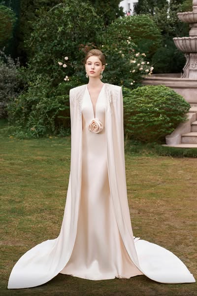 Chiếc váy cưới cúp ngực lụa agate, ôm sát cơ thể, tôn lên đường cong quyến rũ. Phần cúp ngực tinh tế khoe khéo bờ vai thon thả, kết hợp cùng áo choàng mềm mại, thướt tha, tạo nên vẻ đẹp vừa gợi cảm, vừa lãng mạn. Hay chiếc váy cưới tay dài ren Pháp, phom dáng chữ A thanh lịch, kín đáo, dành cho những cô dâu yêu thích sự tinh tế, dịu dàng. Họa tiết ren tinh xảo, đính kết tỉ mỉ, tạo nên vẻ đẹp sang trọng, quý phái.