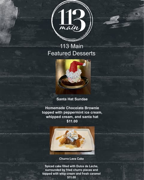 搜索关键词 December specials, Oswego restaurant, Holiday Sundae, Chef Rodrigo, 113 Main, Local restaurant, Kendall County, Christmas time, featured food, craft cocktails优势 Amazing Chef Rodrigo's creations,Return of Holiday Santa Hat Sundae,Available entire month of December,Wide range of options (steak, seafood, cocktails, dessert)
