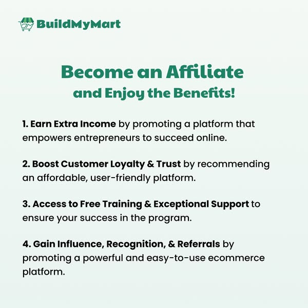 Join our affiliate program and earn commissions by referring businesses to BuildMyMart! Help clients set up beautiful, affordable online stores while you make passive income. Sign up now! 📈✨