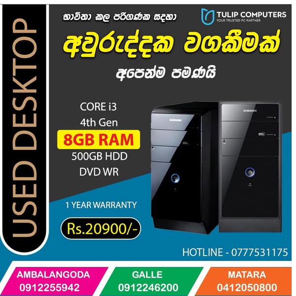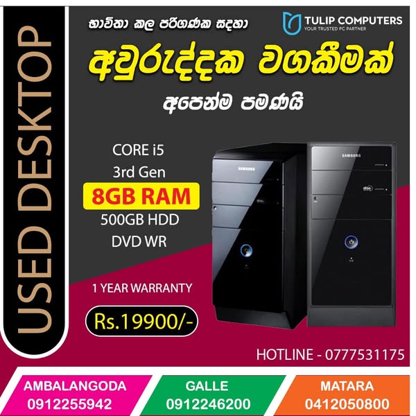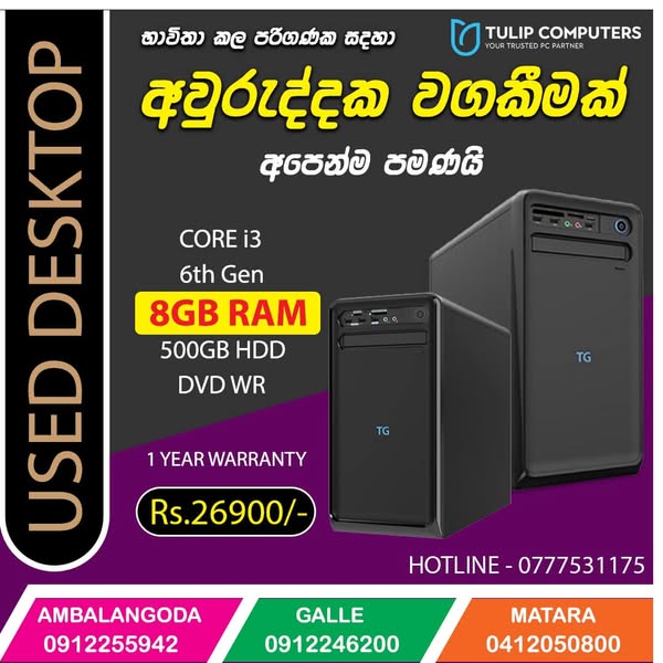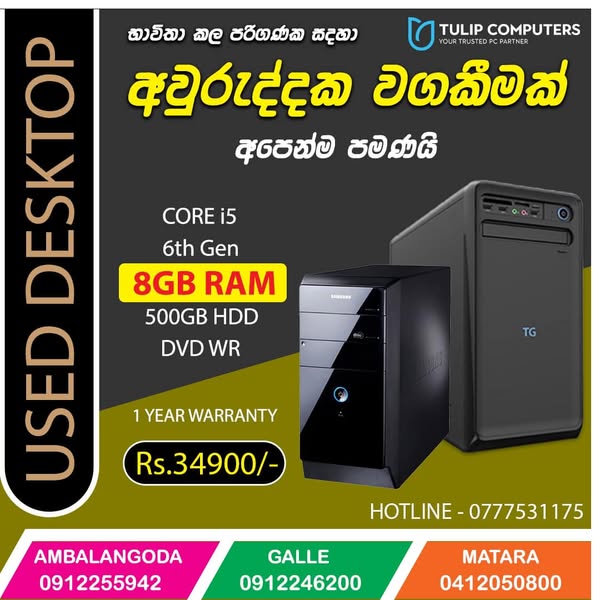 搜索关键词 used computers warranty, Sri Lanka computer, Ambalangoda Matara Galle, gaming desktop, PC components, desktop components, laptop sales, computer sales, PC build, Tulip Computers优势 One-year warranty on used computers,Available at multiple locations (Ambalangoda, Matara, Galle),Wide range of brands (AMD, Intel, MSI, ASUS etc.)