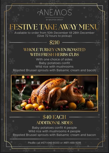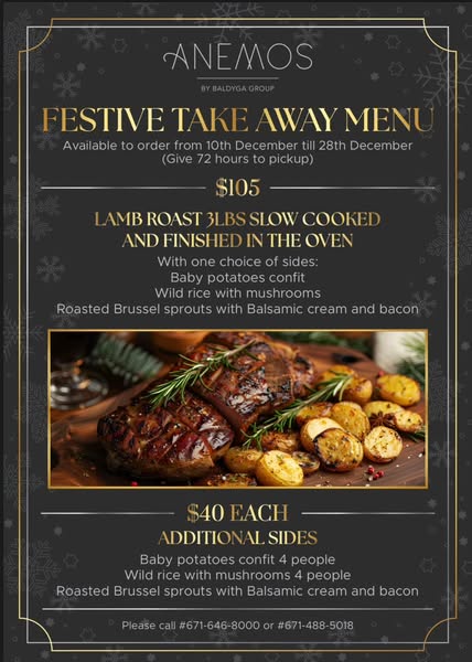 搜索关键词 holiday takeaway, Guam food, festive platters, BBQ ribs, turkey roast, Christmas dinner, Thanksgiving food, restaurant Guam, dine in Guam, special promotion Guam优势 Delicious holiday menu,Convenient takeaway option,Variety of main and side dishes