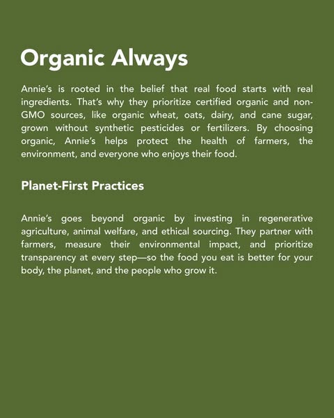 Today, Annie’s continues that mission by investing in regenerative farming, animal welfare, and ethical sourcing. Every bite is crafted to nourish your family, support farmers, and protect the environment for future generations💛