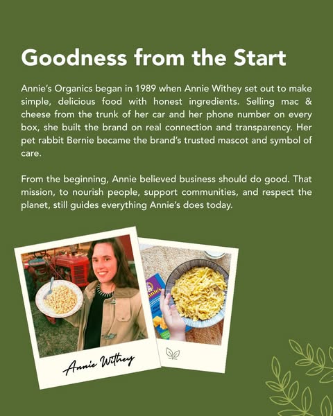 Since 1989, Annie’s has been committed to making simple, delicious food with organic, non-GMO ingredients🌱 From the early mac & cheese days with Bernie the bunny on the box, they’ve built a brand rooted in honesty, transparency, and care for people and the planet🌍✨