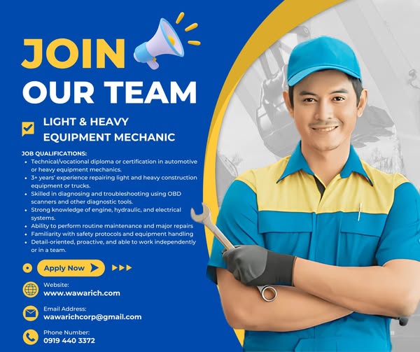 "Keep our machines moving!" We're hiring skilled Mechanics to maintain and repair trucks and heavy equipment. Must be experienced in diagnostics, especially with OBD scanners, and familiar with engine, hydraulic, and electrical systems.
