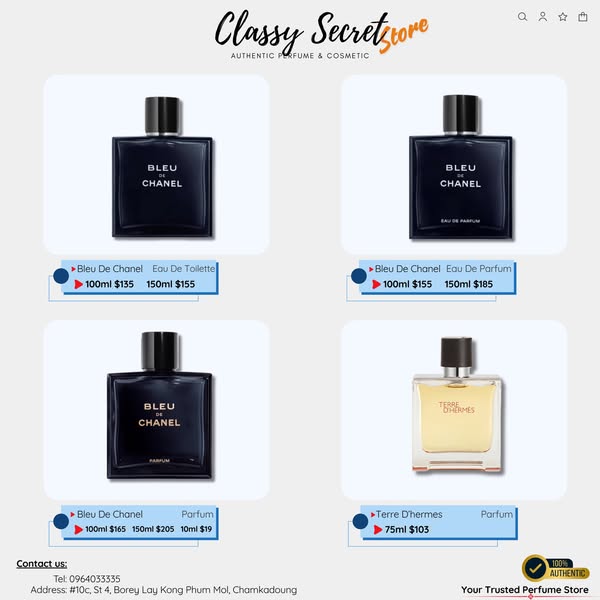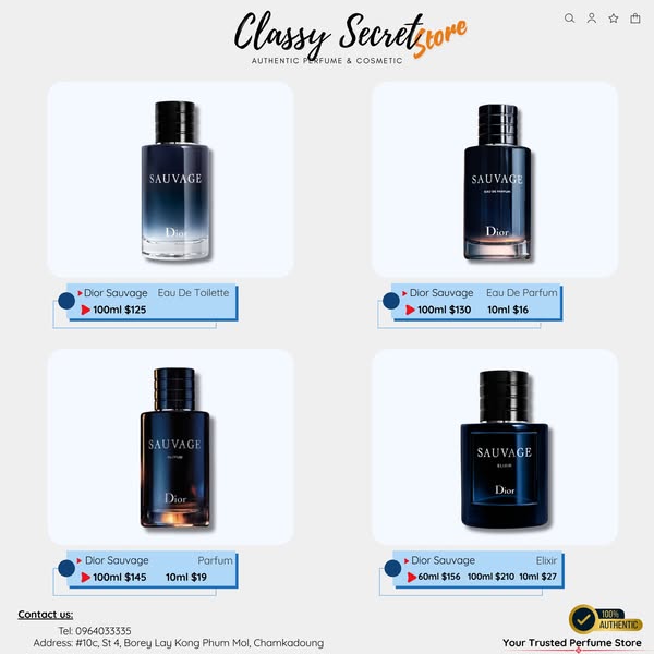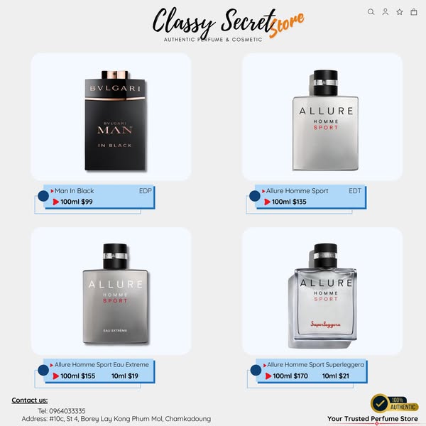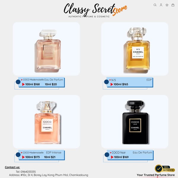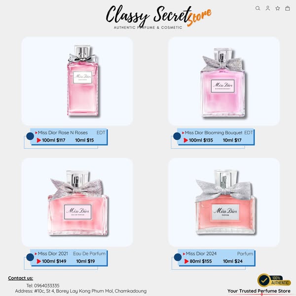 搜索关键词 original perfume, authentic fragrance, perfume discount, gift wrapping, Phnom Penh delivery, nationwide shipping, classy secret store, imported perfume, france perfume, women perfume优势 100% Authentic,Special Discount,Free Gift Wrapping,Delivery in Phnom Penh & Nationwide Shipping,Available in 10ml & 20ml atomizers