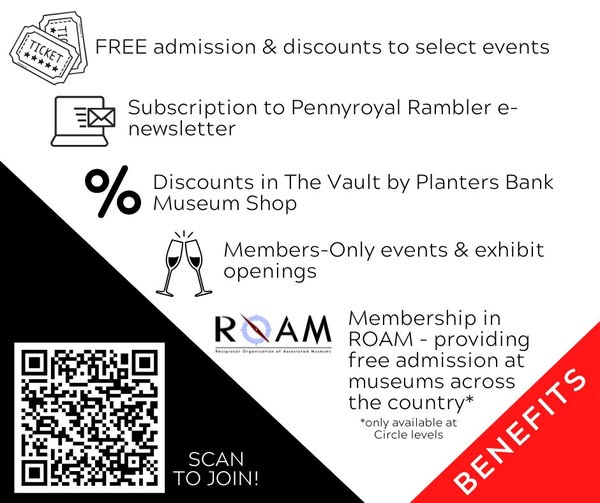 🌟Benefits for all memberships include free admission to the museum, subscription to the Pennyroyal Rambler e-newsletter, early access to tickets and reduced rates for select events, and discounts in The Vault museum shop. Circle levels also provide free research requests, venue uses, and membership in ROAM, a network of museums in North America and beyond that extends the benefit of reciprocal free admission to participating museums.