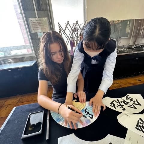 Each student received their name written in Kanji, specially chosen by their Japanese buddies to reflect their personality and spirit. They then carefully brushed their Kanji onto a beautiful folding fan (sensu) – a unique and personal souvenir to take home to the USA. 🇺🇸🎁
