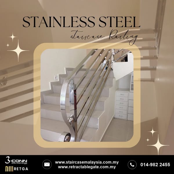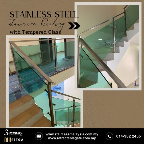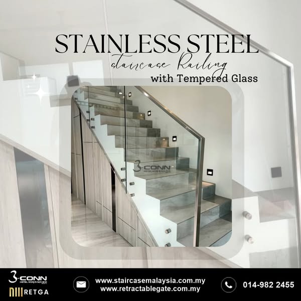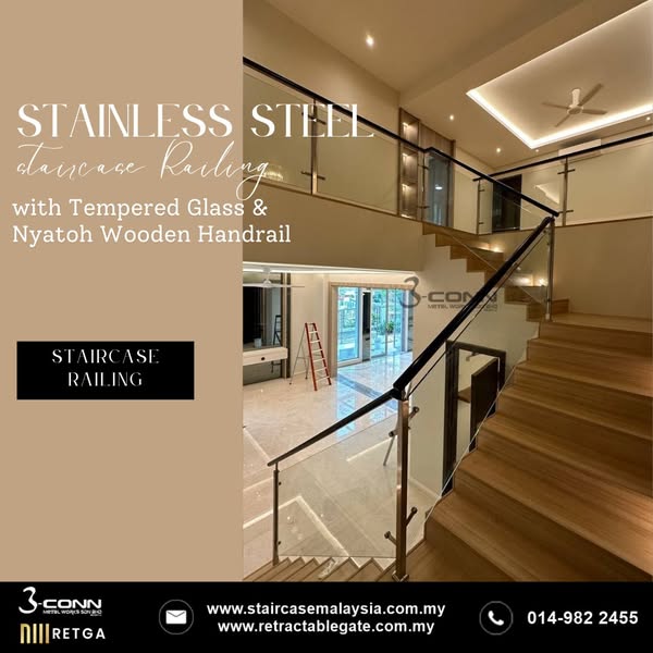 搜索关键词 staircase railings, malaysia staircase, home improvement, modern railing, classic railing, stainless steel railing, tempered glass, mild steel, stair design优势 Variety of styles (modern, classic),Options for different materials (mild steel, stainless steel, tempered glass, nyatoh wood),Direct contact for sales and inquiries (WhatsApp, phone)