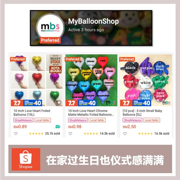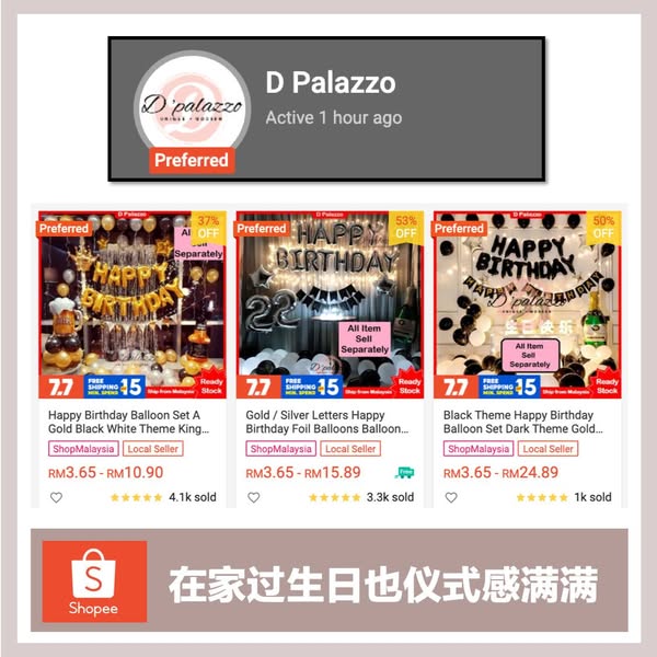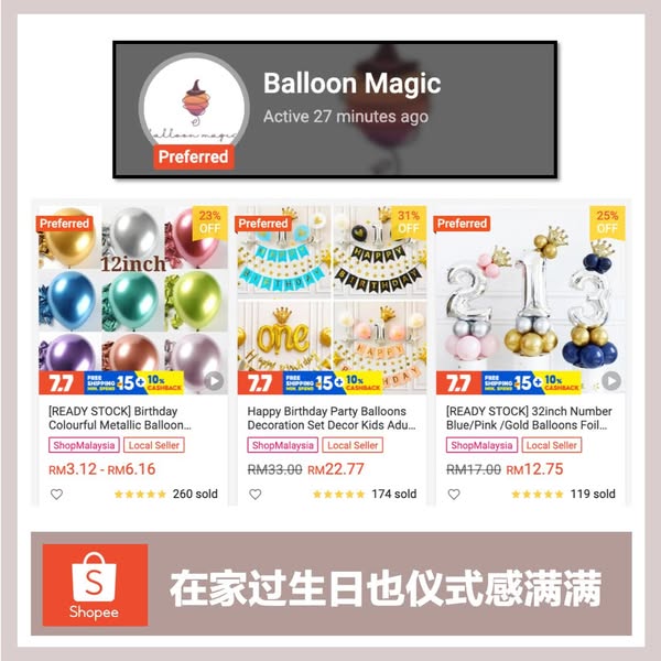 Shopee 8家派对装饰用品店铺🎈!在家庆祝生日也能仪式感满满🥰!
