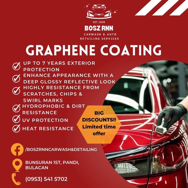 搜索关键词 graphene coating, car detailing service, car wash Pandi, auto detailing Bulacan, car exterior protection, scratch resistant coating, car polishing, free car wash, car paint protection, Bunsuran carwash优势 Up to 7 years exterior protection,Scratch, chip, and swirl mark resistance,Enhanced glossy appearance,Hydrophobic and dirt resistant,UV Protection,Chemical resistance,Heat resistance,Free Full Car Polish,Free Car Wash,Free Tar Removal,Free Iron Removal,Free Water Marks Removal,Free Light Scratch Removal,Free Acid Rain Removal,Free Asphalt Removal,Free Swirl Marks Removal,Free Paint Correction,Free Side Mirror Coating,Free Wind Shield Coating,Free Head and Tail Light Coating,Free Mags/Rims Coating