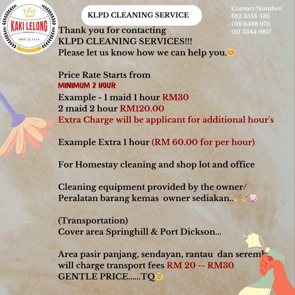 搜索关键词 cleaning service, port dickson cleaner, home cleaning, office cleaning, cleaning service near me, seremban cleaning, lukut cleaning, springhill cleaner, house cleaning, commercial cleaning优势 Transport provided,Payment after completion,Variety of locations