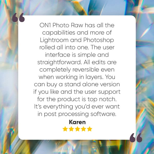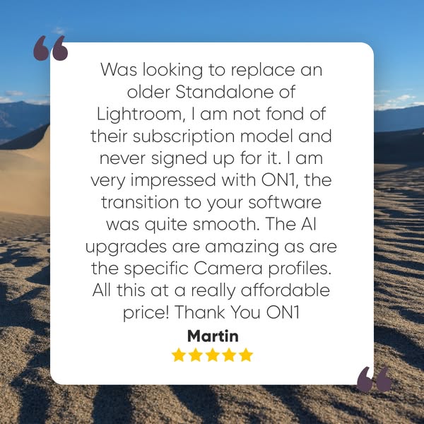 Robert says ON1 combines the best of Lightroom and Photoshop, with AI-powered tools like NoNoise AI and Brilliance AI built-in.