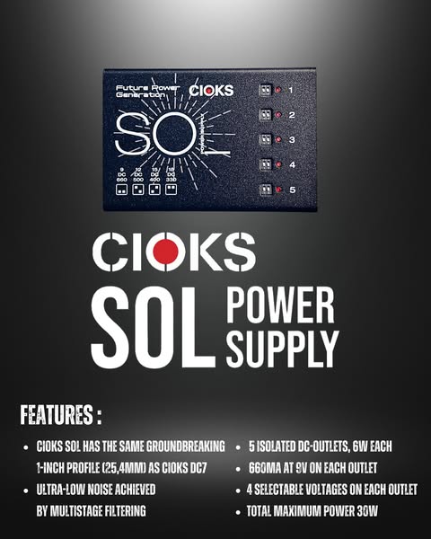 非常受歡迎的 CIOKS Power Supply,DC7 及 SOL 分別設有 7 個及 5 個 outlet,於 9V 可輸出達 660mA,厚度只有 1 吋,十分容易收納於 Pedalboard 底部,並可以直接對應 Templeboard 安裝,想為 Pedalboard 提供足充電源,又想保持輕便嘅朋友快啲嚟睇下啦!