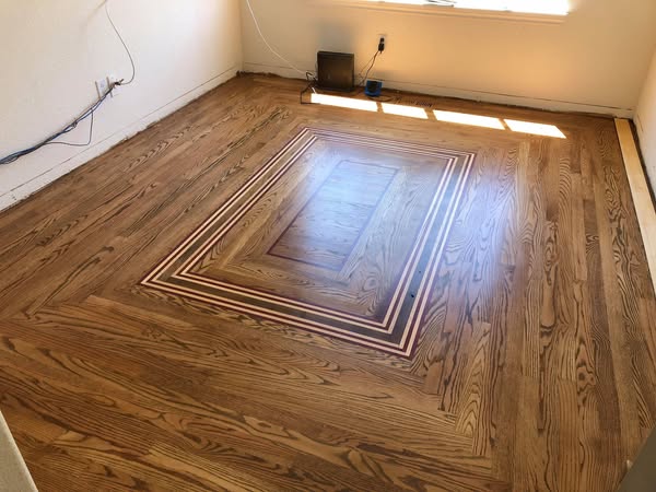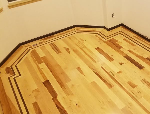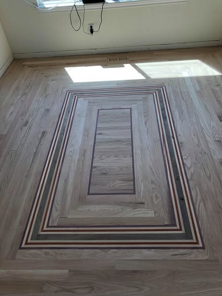 "Super cool floors by Chris and Mark! Installed new 4" hickory floors with a natural finish in place of old carpet in the family room and office. Chris designed and installed a beautiful walnut accent border around the perimeter of the office that really makes it stand out! Also installed red oak for the dining room and living room that perfectly matched the existing flooring in the kitchen to tie it all together. The existing red oak in the kitchen and main entry area was refinished in the natural state to match the new floors. The result is a much lighter, brighter feeling in the whole first floor. We feel like we have a new house!🤩" - Brian G., Brighton, CO