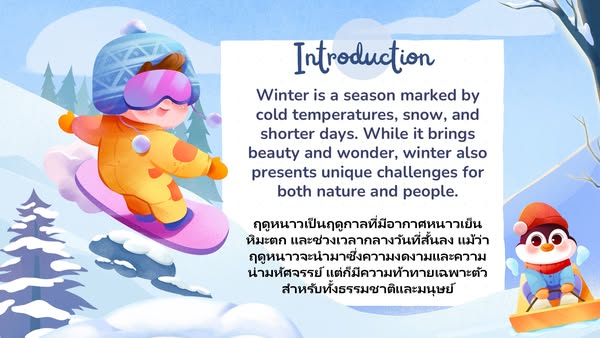 ❄️✨ สวัสดีฤดูหนาว! ☃️ ในประเทศเขตหนาว ฤดูหนาวถือเป็นช่วงเวลาที่หลายคนตั้งตารอ เพราะมันเต็มไปด้วยมนต์เสน่ห์ที่ไม่เหมือนฤดูไหน ๆ ❄️ เมื่ออากาศเริ่มเย็น (cold weather) และหิมะ (snow) เริ่มตก บรรยากาศรอบตัวก็เหมือนภาพในหนังสือเทพนิยาย (fairy tale) 🌨️ ทุกสิ่งทุกอย่างถูกปกคลุมด้วยสีขาวนวล ราวกับโลกได้ถูกแปลงโฉมให้เป็นโลกแห่งความฝัน (winter wonderland) 🌌✨
