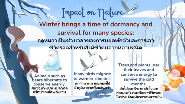 ถ้าพูดถึงฤดูหนาวก็ต้องพูดถึงสัตว์ที่อาศัยอยู่ในเขตหนาว (winter animals) ด้วย 🐾 เช่น หมีสีน้ำตาล (brown bears) 🐻 ที่ต้องนอนหลับยาว ๆ (hibernate) เพื่อสะสมพลังงานในช่วงที่หาอาหารยาก 🐻 หรือเจ้ากระต่ายสีขาว (white rabbit) 🐇 ที่ต้องพรางตัวให้กลมกลืนกับหิมะ (camouflage in the snow) เพื่อไม่ให้ถูกผู้ล่าจับตัวไป 🐾 สัตว์เหล่านี้ต่างมีวิธีเอาตัวรอด (survival tactics) ในฤดูหนาวที่น่าทึ่งจริง ๆ ค่ะ!