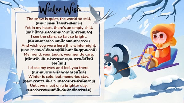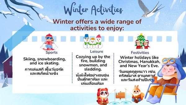 ฤดูหนาวนั้นไม่เพียงแต่เป็นช่วงเวลาแห่งความหนาวเย็น (cold season) ❄️ แต่ยังเต็มไปด้วยความสุข (joy) ความสนุกสนาน (fun) และความอบอุ่นที่ซ่อนอยู่ในทุก ๆ กิจกรรม (hidden warmth in every activity) ไม่ว่าจะเป็นการลื่นไถลลงเนินหิมะ (sledding downhill) การปั้นตุ๊กตาหิมะ (building a snowman) การเล่นสเก็ตน้ำแข็ง (ice skating) หรือแค่นั่งข้างเตาผิงแบบชิล ๆ (relaxing by the fireplace) ฤดูหนาวนี้คือเวลาที่ทำให้เราหวนคิดถึงความสนุกและความสุขในช่วงชีวิตที่เรียบง่ายที่สุด (recall the simple joys of life) ค่ะ 😊💙✨