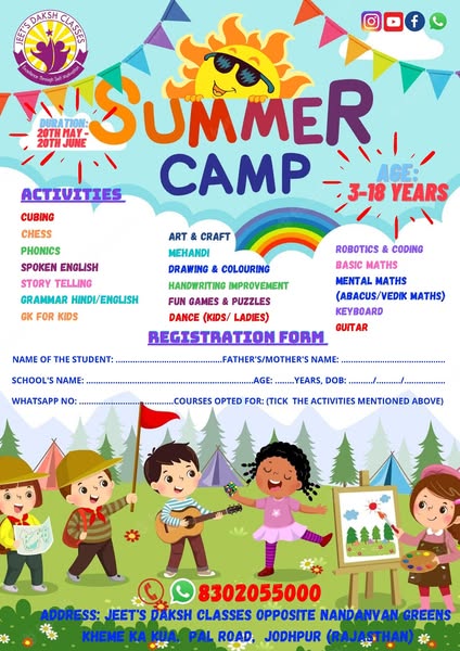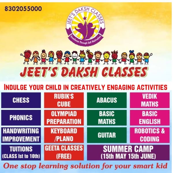 搜索关键词 summer camp Jodhpur, kids activities India, educational summer program, children learning skills, robotics and coding camp, spoken English classes, handwriting improvement course, art and craft workshop, fun games for kids, Jeet Daksh Classes优势 Wide range of activities,Suitable for different age groups (3-18),Located in Jodhpur,Focuses on learning, creativity, and fun
