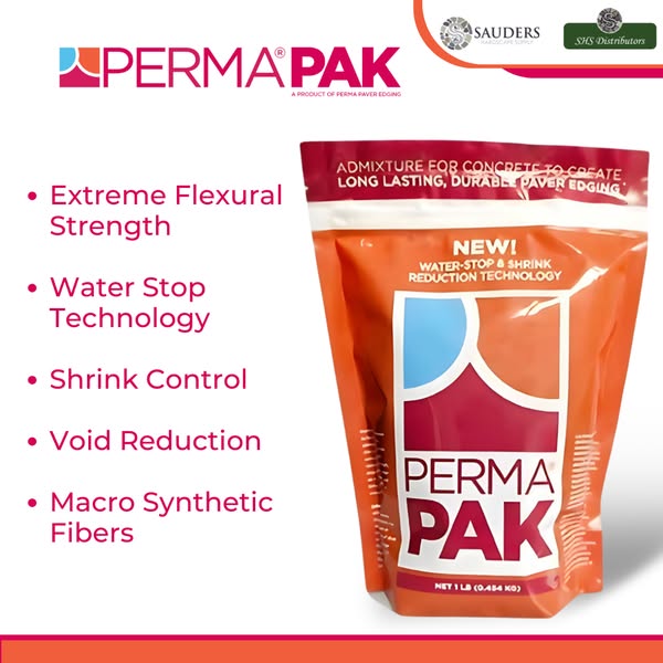 Perma PAK is a blend of five admixtures designed to be mixed with concrete on-site. It enhances paver edging by increasing flexural strength, improving water resistance, and reducing voids for longer-lasting concrete. Perma PAK helps reduce shrinkage and cracking, enhancing durability. The product is easy to mix and applies quickly, offering efficient and long-lasting results. Recommended for use with 3000 psi or greater concrete. Full details, including mixing instructions and product yields, are available on the SHS Distributors website.