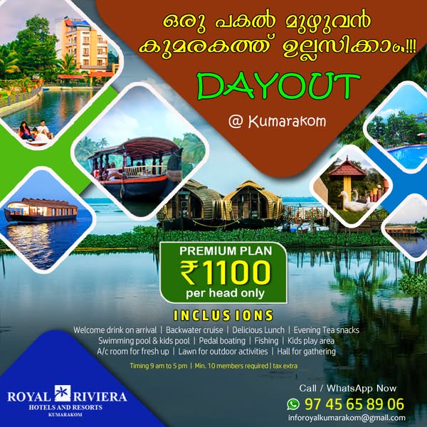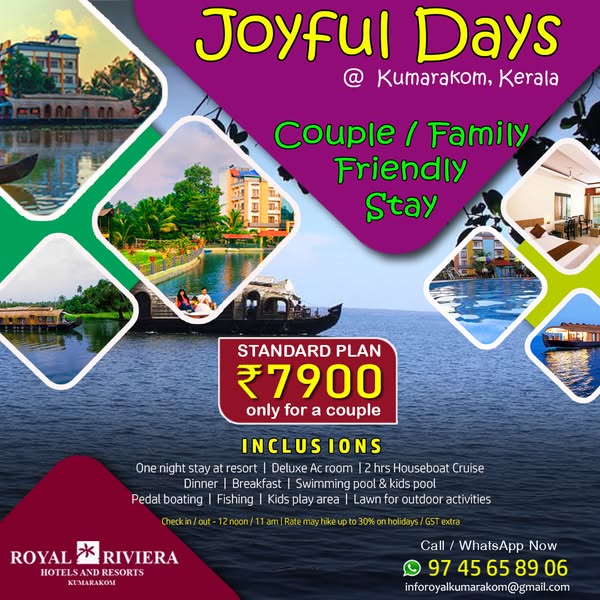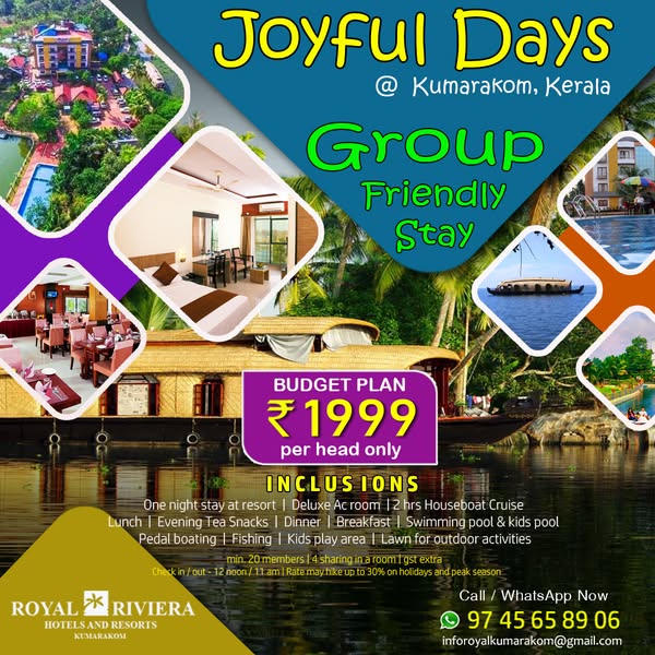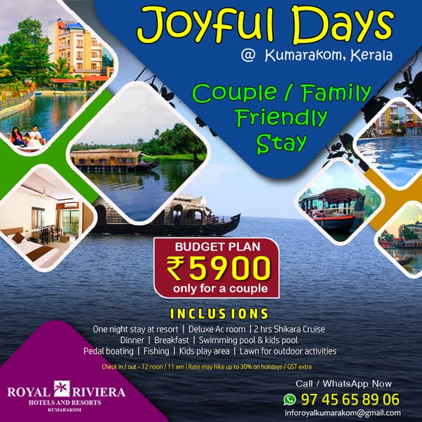 搜索关键词 Kumarakom Kerala packages, Royal Riviera Resort, Kerala family vacation, Kerala group tour, Kerala honeymoon packages, Kerala resort stay, Kerala day out, Kerala entertainment, Kerala tourism, Kumarakom resort deals优势 Suitable for couples, families, and groups,Day out and stay entertainment packages available,Escape to a scenic location (Kumarakom, Kerala)
