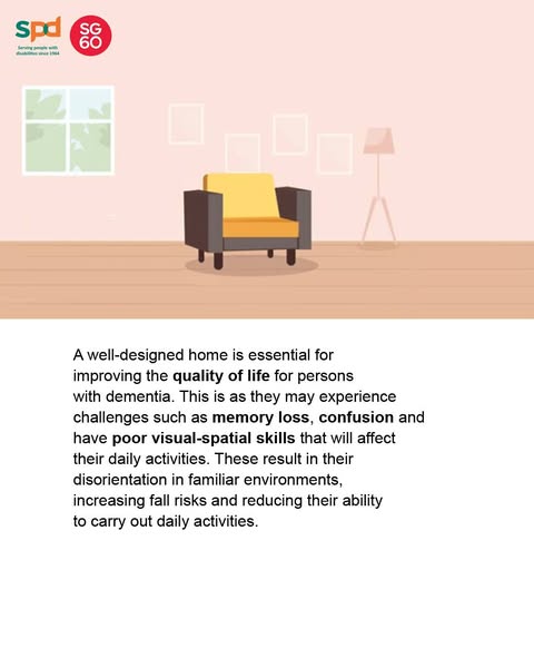 A well-designed home is essential for improving the quality of life for persons with dementia. They may experience challenges such as memory loss, confusion and have poor visual-spatial skills that will affect their daily activities. These result in their disorientation in familiar environments, increasing fall risks and reducing their ability to carry out daily activities.